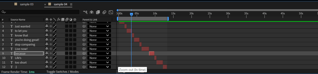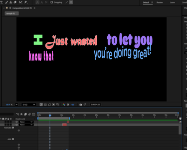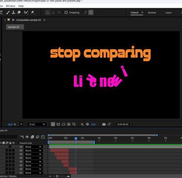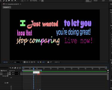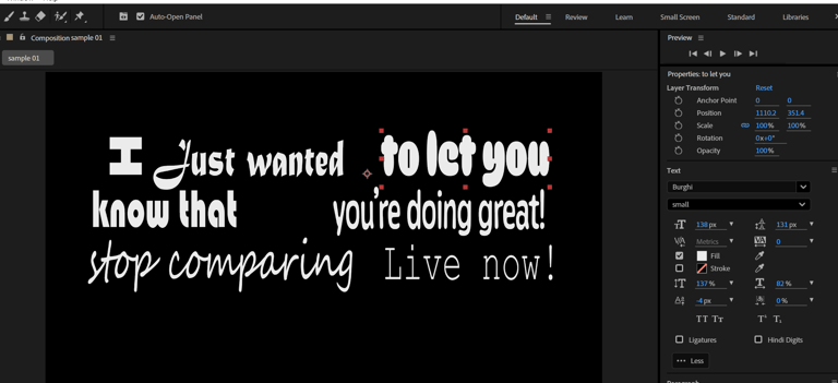 For the second and third compositions, I started by copying and pasting the text from the first comp so I didn’t have to retype everything. I then adjusted the length of the text layers to control the timing i n a way that they look different from each other. After that, I changed the fonts and colours using the Text and Paragraph panels. Finally, I applied various animation presets and adjusted the keyframes.