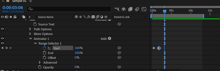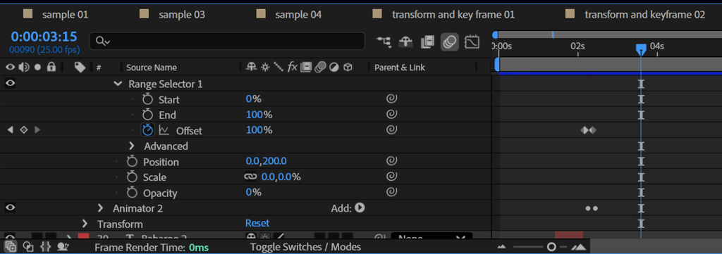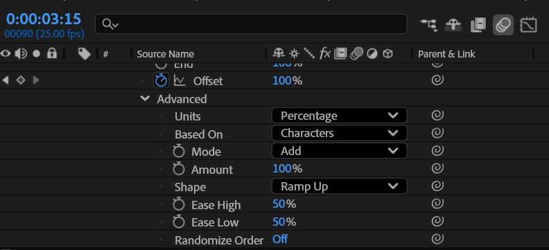 Bounce Animation: I applied Position, Scale, and Opacity through the text animator. In the Range Selector, I set the values from -100 to +100 and selected Ramp Up in the Advanced settings. To enhance the effect, I duplicated the animator (Ctrl+D) and offset the second set of keyframes by 10 frames for smoother motion. In this second animator, I reversed the position value, adjusted the scale from 0 to 150, and removed the opacity, creating a layered, bouncy movement.
