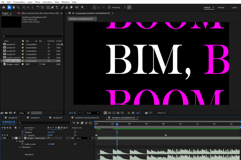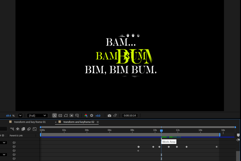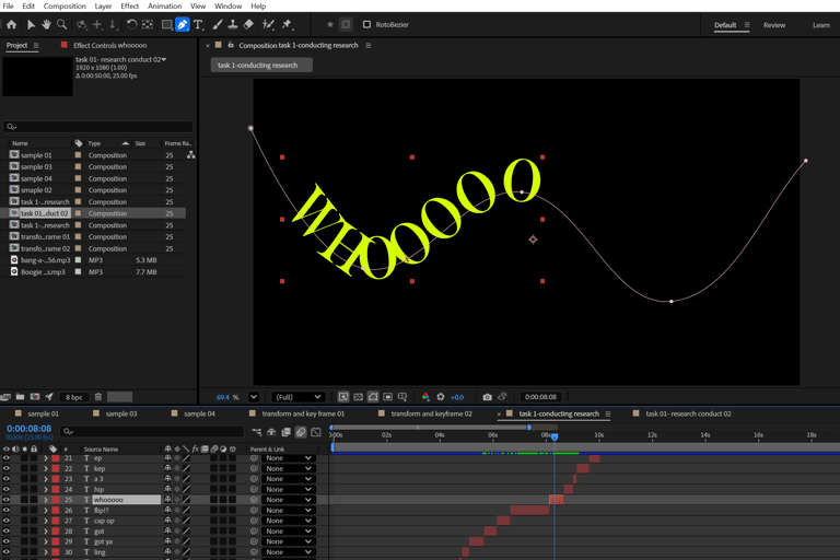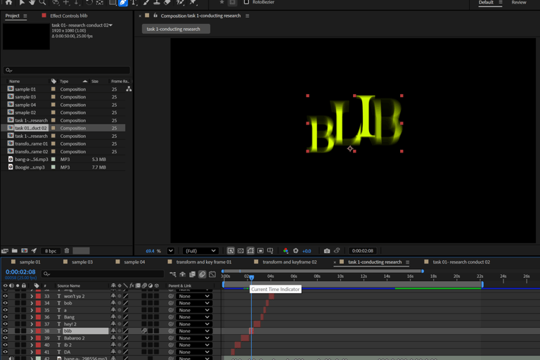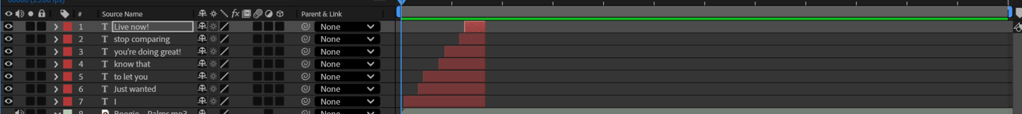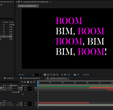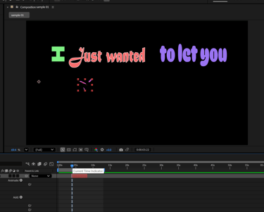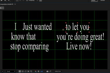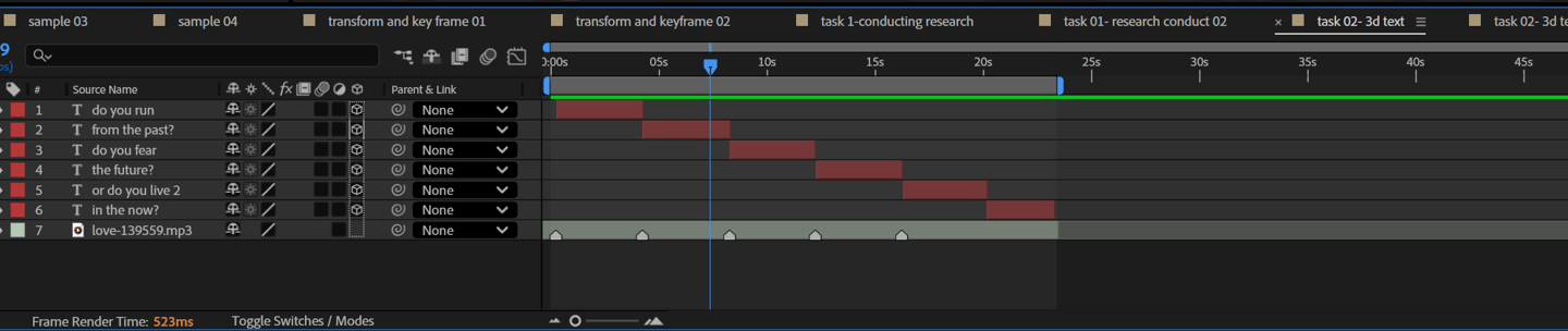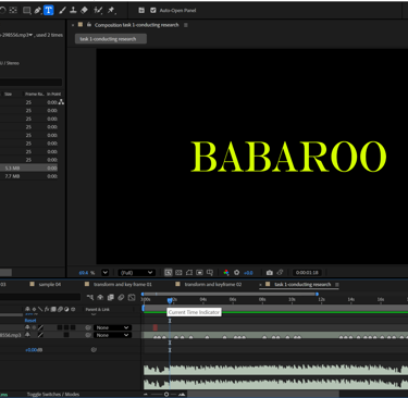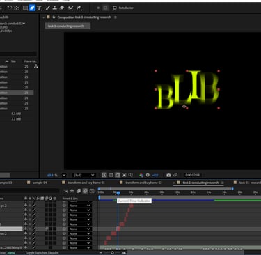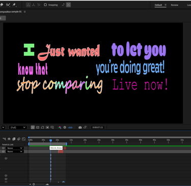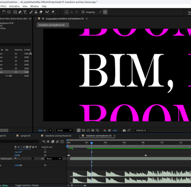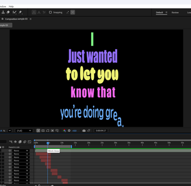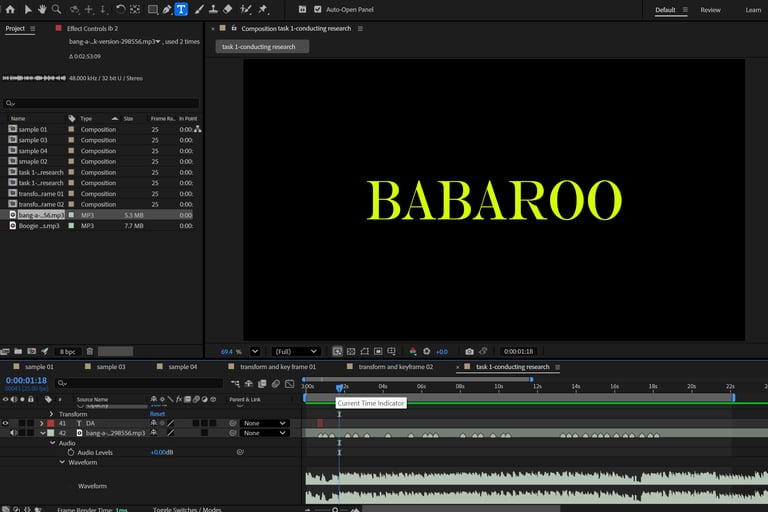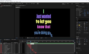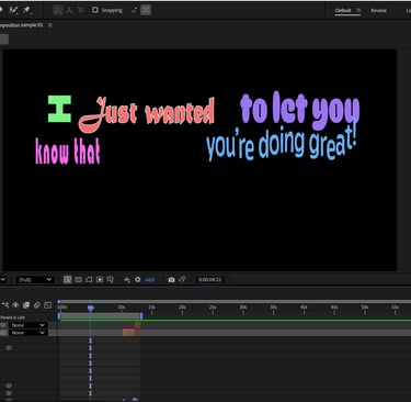For the compositions, I imported royalty-free music, added markers on the beats, and refined the timing of my text animations. I worked on synchronising the compositions to the audio, ensuring the motion aligned closely with the rhythm for a more cohesive and polished outcome