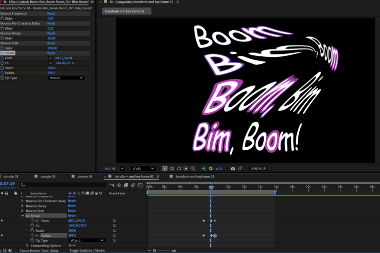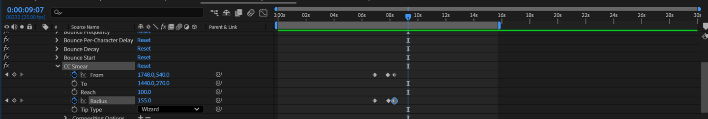 CC Smear → animated the From point and Radius with keyframes to distort the text dynamically.