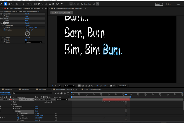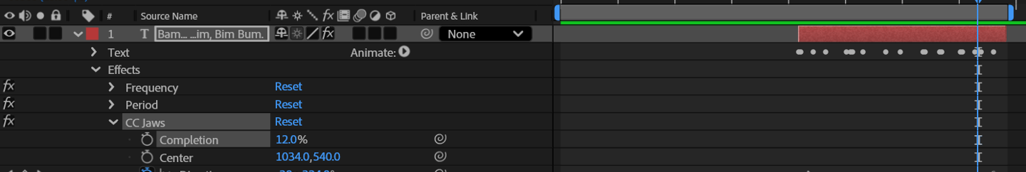 CC Jaws → added keyframes for Direction, and modified Width and Completion to give the text a sharper, cut-like movement.
