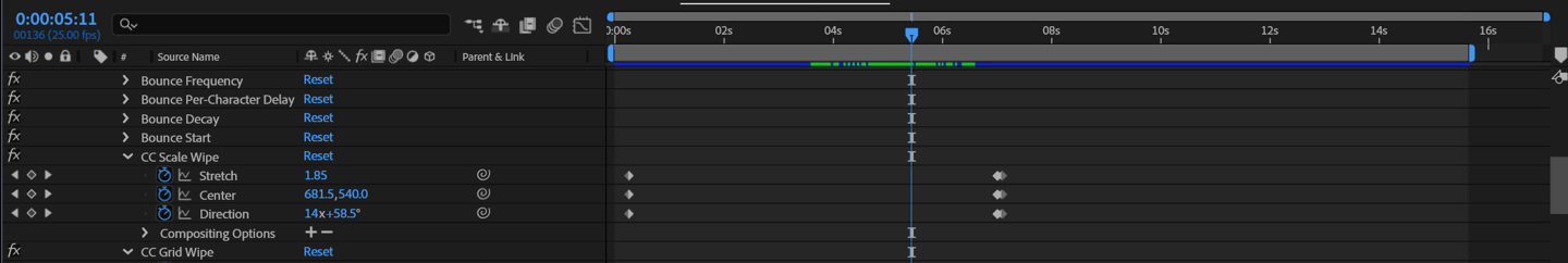 CC Scale Wipe → keyframed Stretch, Centre, and Direction for a stretched transition effect.