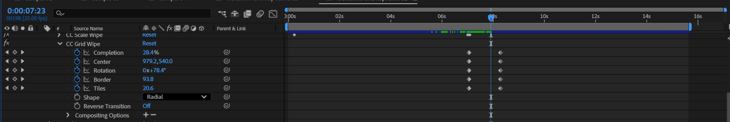 CC Grid Wipe → animated Completion, Center, Rotation, Border, and Tiles for a layered grid reveal.