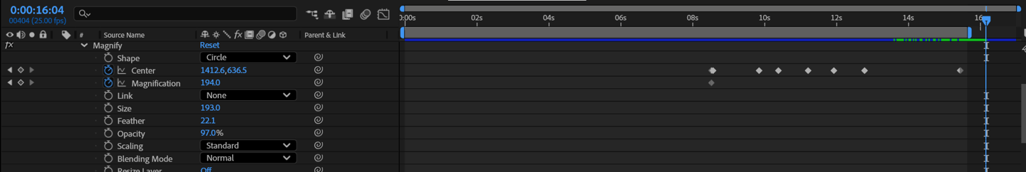Magnify → increased Magnification and Size, then added keyframes for the Effect Center while shifting the Anchor Point positions for varied focus.