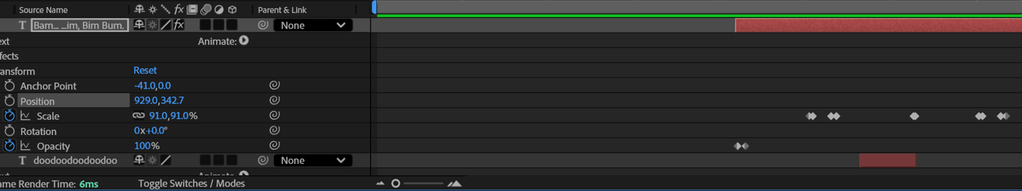 First text layer: Opacity, Scale, and Position changes for depth and emphasis.