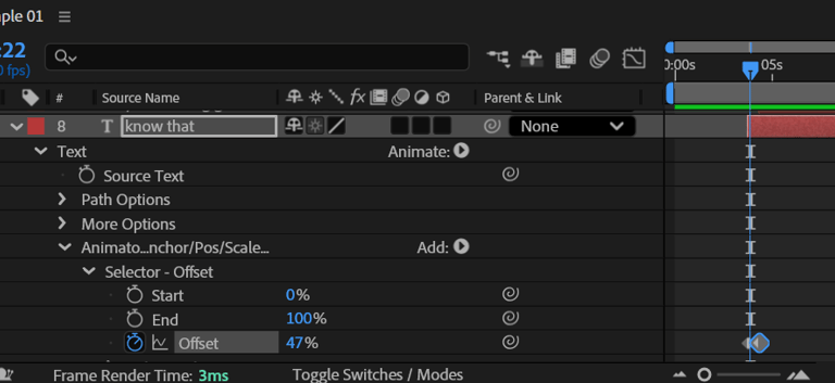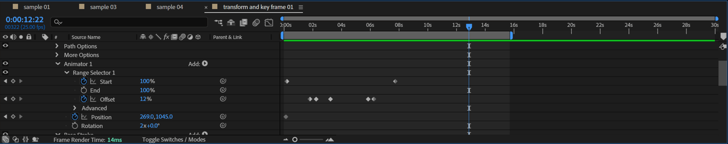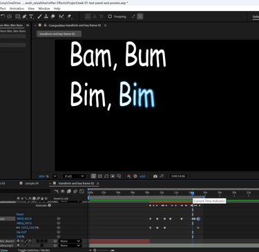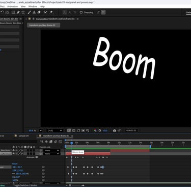 Applying animation presets: I added an animation preset from the Effects & Presets library, then adjusted the Start/End keyframes and Offset. Animating the first text layer: At the end of this layer, I added a second preset and introduced opacity keyframes, making the text fade in/out precisely.