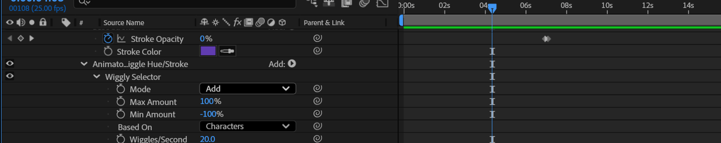 Animating the second text layer: I chose a preset from the Fill & Stroke folder and fine-tuned its keyframes.