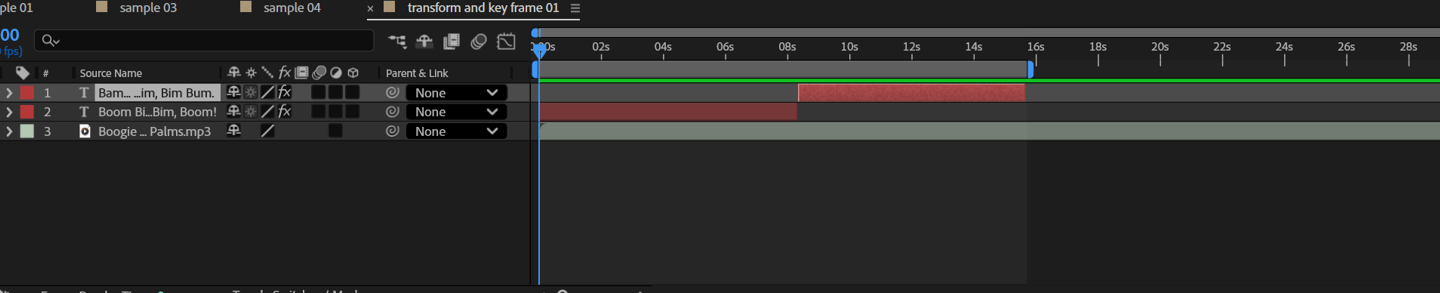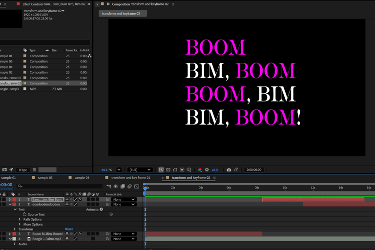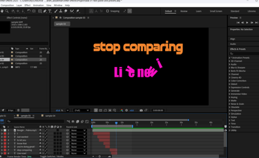 New composition setup: I duplicated the two text layers and audio track into a new comp, then changed the font and color for a fresh look. I also added a third text layer.