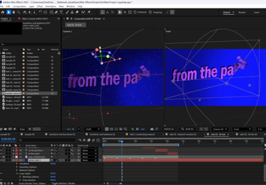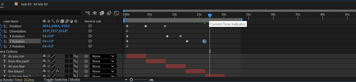 After setting up the base, I added keyframes to the camera’s position, rotation, and point of interest, which allowed me to create smoother and more dynamic camera movements throughout the composition.