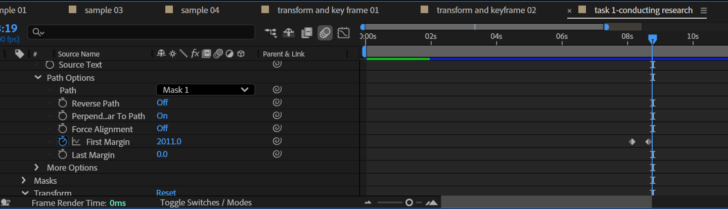 Text on Path Animation: I first drew a path line and refined it by curving the anchor points with Alt + Left Click. Then, I animated the text along this path by adding keyframes to the Path Options > First Margin property, creating a flowing motion around the curve.