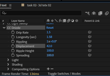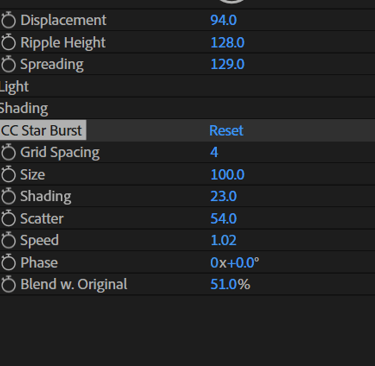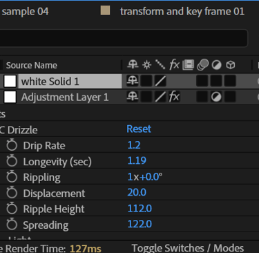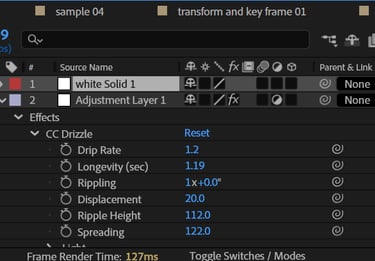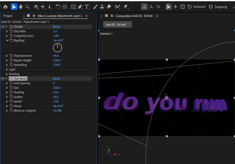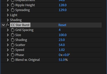 Adjustment Layer: I added an adjustment layer on top of the composition and applied two effects: CC Drizzle for a rain-like overlay and CC Star Burst for dynamic light streaks.