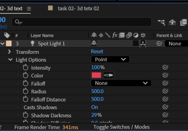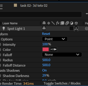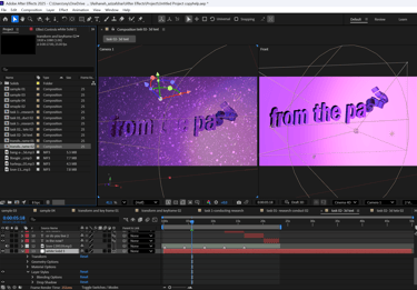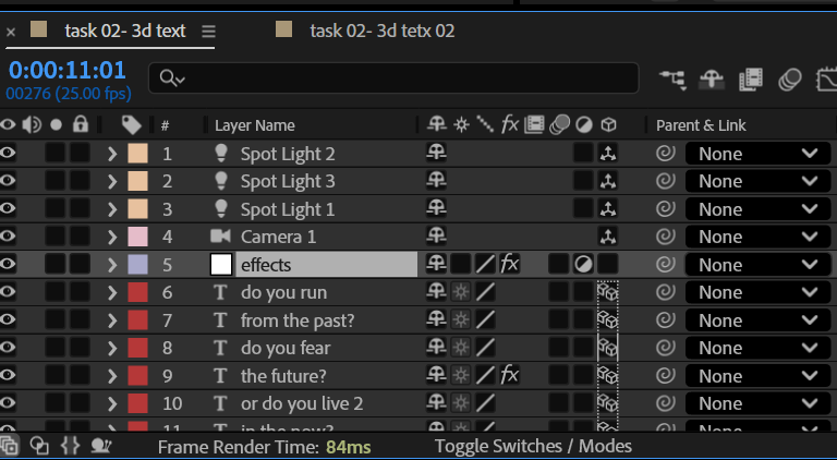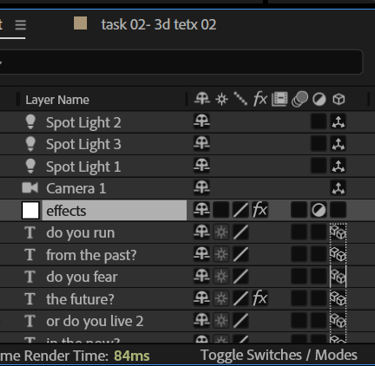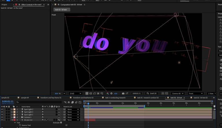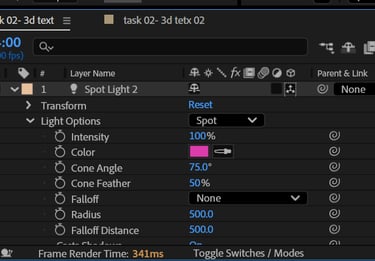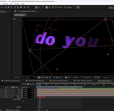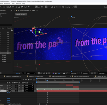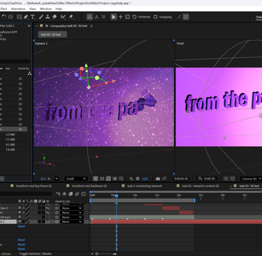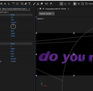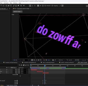 For Task 2 (animating 3D text with camera, lighting, and effects), I was not able to experiment as extensively as I did in Task 1. My computer often crashed when I attempted more complex techniques, so I focused on doing as much as possible within those limits. Despite the technical issues, I still explored camera movement, lighting adjustments, 3D text, and background effects to create a complete composition.