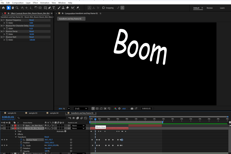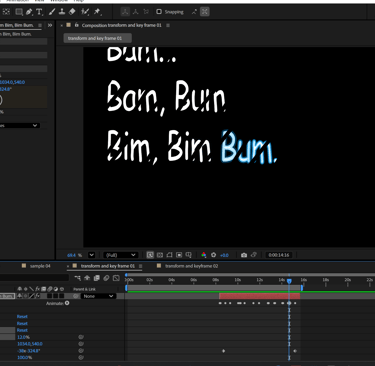Second text layer: Opacity, Scale, and Rotation to give variation and movement across the comp.