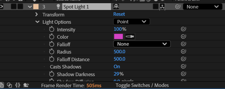 3D Layering: I enabled the 3D layer option for each text, then added three light layers and a camera layer. I adjusted the lighting and camera using the 3D gizmo across the XYZ axis.