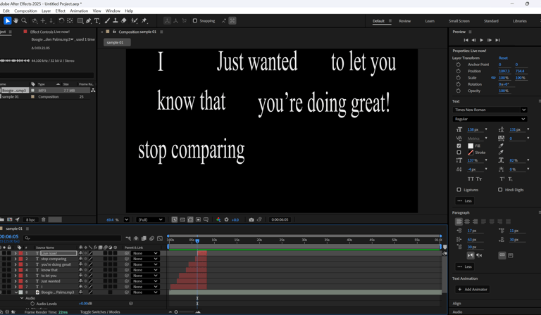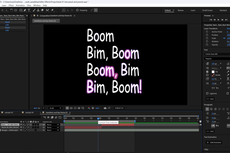 Animations: Finally, I applied animation presets to each text layer, syncing them with the music for a dynamic 3D motion effect.